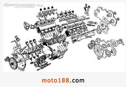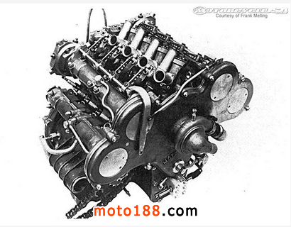 盡管只有500排量,但V8卻擁有當時最復雜的發動機系統,即使放到現在也不遑多讓。發動機共有8缸,每缸帶獨立化油器,16氣門,兩套曲軸箱,最高速度可達283km/h,在那個年代,V8就是超級摩托。