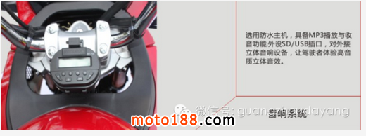 核心提示: 大陽梟雄DY200-5旅行版摩托車集手機充電、音樂播放、調頻收音機、高保真楊聲器于一身 當你在網上沖浪手機木有電時,梟雄能