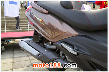 其實MAXSYM 600i 已經在車界流傳已久,在這幾年的米蘭車展中,也一直出現在SYM 的展區當中,去年也在歐洲上市開賣,這次展出實車顏色為全新的棕色,國外現行的車色也沒有此色,應該是專屬臺灣市場,外觀與MAXSYM 400i 幾近相同,座墊有紅線繡邊及MAXSYM 字樣。
