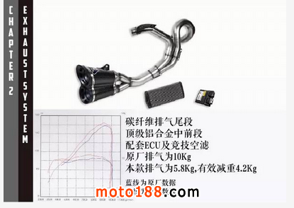 碳纖維全段,這款排氣不僅動力有所提升,而且它的重量比原廠排氣減輕了足足4.2kg,全套還配備有ECU及競技空濾。
