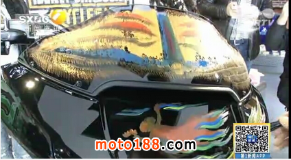 中國敦煌國際形象大使邢東:我用的顏料是中國畫的最傳統(tǒng)的顏料,也就是礦物質顏料,這個跟西方的顏料色彩的成分是不一樣的。我剛剛在上面畫的底層的圖案是哈雷戴維森的那個摩托的它的一個基礎色,是那種橘黃代表著熱情奔放的這種西方的這種特點,但是我用中國的敦煌的這種壁畫的色彩就是很亮麗,帶著一種朦朧的美來融合進去,它就出現(xiàn)了一種東西方的一種交融。