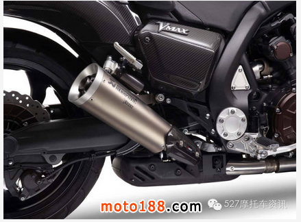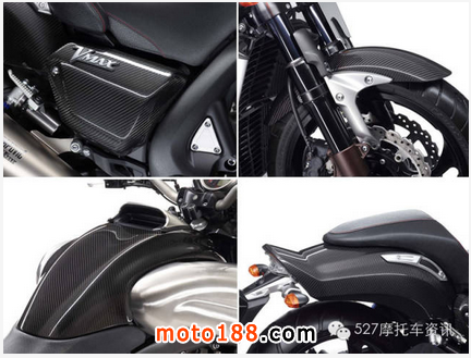 不管是油箱護罩、前后擋泥板、還是側面的護板,VMAX Carbon全都采用碳纖維材料,排氣上雅馬哈也聯手Akrapovic(天蝎),使得VMAX Carbon更加犀利。