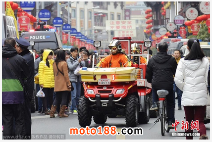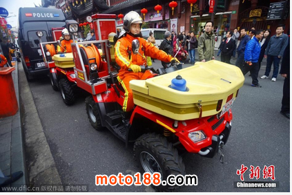 核心提示: 2015年2月24日,上海,羊年初六的城隍廟,上海市消防局外灘中隊的摩托消防車在人群中尤為引人注目。春節期間根據保衛任務,外