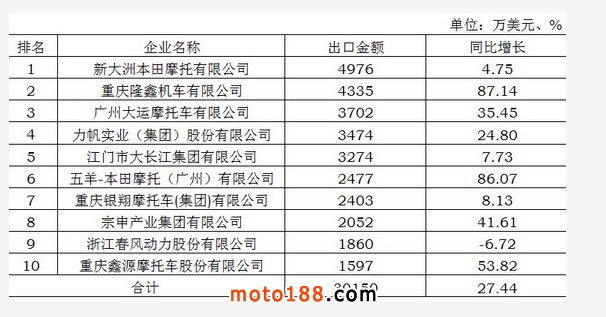 核心提示: 2015年1月國內摩托車企業出口金額排名 TOP10