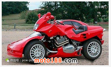 從圖片中可以看出,這款偏斗三輪摩托最大的特點在于機車旁邊那完全仿照法拉利跑車打造的乘客艙。