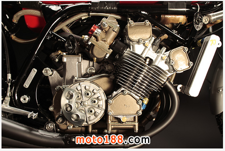 當年賽季的GP250組,本田推出了前所未見的RC166賽車:雖然排氣量只有區區249.42cc,但是居然采用了直列六缸的汽缸結構,這樣每顆汽缸只與拳頭大小相當!但是你可千萬別小覷這些“小拳頭”,因為采取的是強化轉速的設計思路,轉速紅線高達18000rpm!為了滿足超高轉速的需要,這臺RC166安裝了當時很罕見的雙頂置凸輪軸(DOHC),而且由齒輪而非鏈條驅動氣門,同時還安裝了6只化油器,每只氣缸都有獨立化油器伺候,以保證高轉速時“呼吸”能夠跟得上。由于直列六缸采用的是風冷結構,而且轉速超高,為了保證發動機能夠持續高動力輸出,RC166還安裝了小型機油散熱器,以降低發動機的高溫。