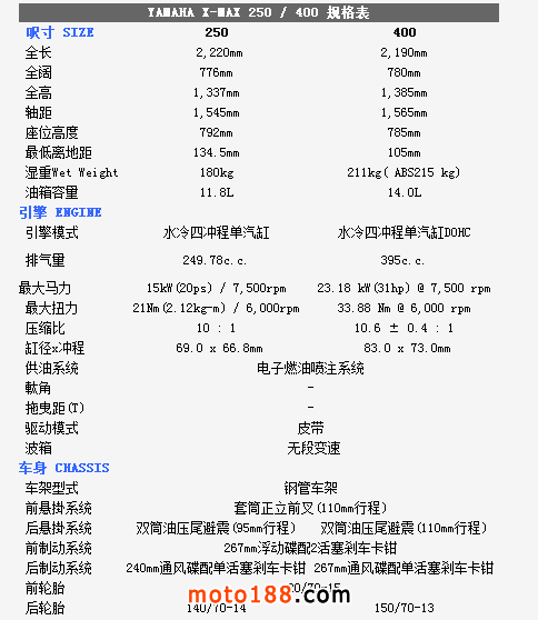根據(jù)資料顯示,X-MAX 400版采用一臺395cc單缸引擎,缸徑x沖程分別是83mm x 73mm,引擎的基本規(guī)格跟MAJESTY 400相同,但馬力卻經(jīng)過輕微調(diào)低(X-MAX輸出31hp,Majesty 400輸出33hp)。雖然如此,但X-MAX的濕重卻比MAJESTY輕10kg,其中原因是前者使用不同規(guī)格的新車架。