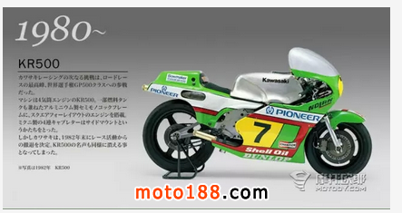 KR500是由川崎在1980年制造的500cc賽車,該車首次亮相是在1980年的GP賽場(chǎng),車手是Kork Ballington。這位南非車手最后以總積分第12名完成比賽。1982年KR500主要更改了Shouwa的避震,最后以第九名完賽,在本賽季中最好的成績(jī)是第六名,隨后該車退休。