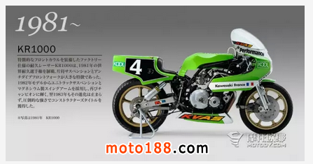 從1981年到1983年,川崎連續(xù)三年在世界耐力錦標(biāo)賽中贏得了制造商的稱號(hào)。在80年代初的耐力賽車場(chǎng)上,石灰綠車手都幾乎沒受到其他廠商的挑戰(zhàn)。KR1000裝備了由法國高性能部門制作的高性能套件,增加其統(tǒng)治力。1982年,它的一些先進(jìn)技術(shù)包括aluminium head pipe、anti-dive front fork、aluminium sub-frame、Uni-Trak rear suspension和magnesium swingarm,讓川崎車手壟斷前四名位置。