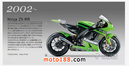 川崎為了登上GP舞臺(tái),研制了ZX-RR賽車,首次亮相是在2002賽季,車手是柳川明。2004年, 中野真矢加入車隊(duì),并登上了日本大獎(jiǎng)賽季軍。2007年,蘭迪德普捏在日本拿下第二名。2008年賽季結(jié)束,ZX-RR隨著川崎車隊(duì)一同退出MotoGP舞臺(tái)。
