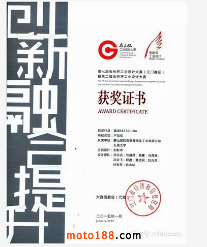 猛龍SK150-10A憑借著其高標(biāo)準(zhǔn)的工藝造型及獨(dú)特的個(gè)性設(shè)計(jì)與創(chuàng)新受到評委們的青睞,獲得了第七屆“省長杯”工業(yè)設(shè)計(jì)大賽(江門賽區(qū))暨第二屆“五邑杯”工業(yè)設(shè)計(jì)大賽產(chǎn)品獎。