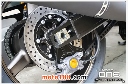 設有預載的43mm套筒前叉,前叉鍍上DLC(Diamond-like Carbon)碳纖色彩令其更具古典,氮氣輔助的雙筒Ohlins尾避震已是原廠配備,省卻了日后的花費,就連那鋁合金搖臂也是烏卒卒的,令人不易察覺原 來的金屬。沿用那「一體式」四活塞對向卡鉗,這設計一直套用在廠方的高性能車子上,信心的保證。鋁合金把手也是原廠配備,相當貼心,就連那表板也是全新設 計,芯片車匙自然少不了﹗