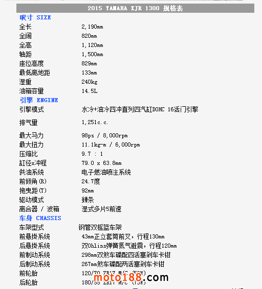 ●在這二十年間,XJR并沒有停產,廠方不斷推出新色吸引騎士,新一代XJR1300在細節上作出了改動,包括排氣管、新油缸、轪把、儀表板、煞車卡鉗及增加了鋁合金車身號碼牌等等,但保留了較原始風冷散熱片的引擎外殼設計。