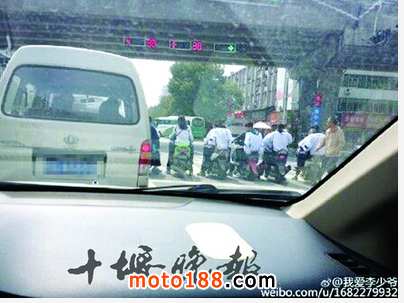 23日13時許,博主開著車準備從柳林溝拐往人民路,在等紅路燈時,發現有5輛摩托車先是停在斑馬線前面,已經越過黃線。在綠燈還沒亮時,這5輛摩托車就飛快地疾馳到人民路,這時后面有1輛落后了,車上的人不停地吆喝,讓其開快點。