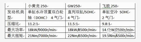 從發(fā)動(dòng)機(jī)主要性能參數(shù)來(lái)看,單缸小黃龍250的功率和扭矩與雙缸GW250基本相當(dāng),但比單缸飛致250要明顯強(qiáng)。