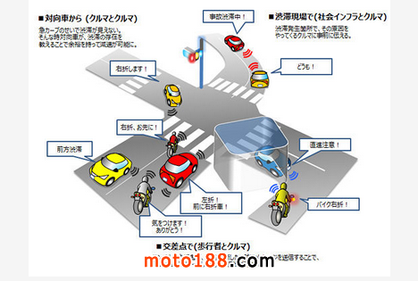 這項無線數據通訊技術是指在汽車、摩托車等移動物體上搭載無線通訊系統,即時提供相關資訊的安全行駛支援保障系統,日前已經在3月11日開幕的東京“第六屆國際自動車通信技術展”上進行實物展示和實際操控。