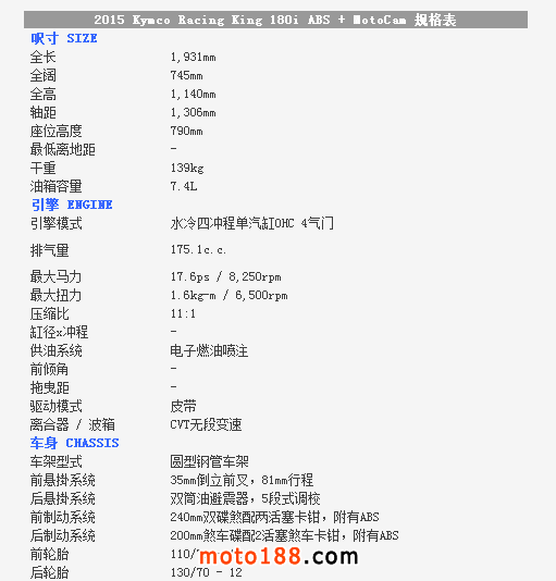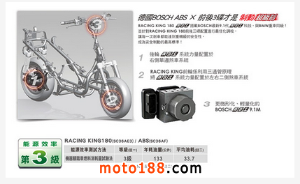 事實上KYMCO RACING KING 180 ABS Motocam的裝備十分突出,倒立前叉、17.6ps馬力、頭孖碟及尾碟等等,推出市場后成為同級之冠,而第二代車輛還加入廠方聲稱與BMW同級的 ABS防鎖死煞車系統,至於今次介紹的車輛已進入第三代,賣點是攝錄鏡頭及8G容量的行車紀錄儀。從這個不斷升級的過程也可看到臺灣機車市場競爭十分激 烈,迫使車廠投放更多武器吸引買家。