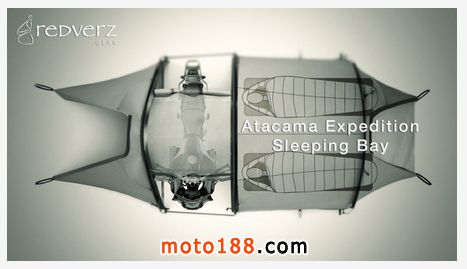 英國出生、軍人、冒險家這幾個關鍵字成就了一個 CEO——Kevin?Muggleton,他的人生中超過 4 分之一的時間都在「這么大的世界上走走」。這 20 年中,他幾乎坐過世界上所有的交通工具,但是毫無疑問,他還是最愛他的摩托車,旅行是他的血,而「家」則是個帳篷。所以他和他的隊伍發明了這個——Atacama 探險摩托車帳篷,一個可以把摩托車放進室內的雙人帳篷。這個 23 英寸大的帳篷是一個三居室,當然大屋必須是給摩托車住的,人可以睡在兩個小屋,不論你開的是哈雷、街跑或者越野,254×96 厘米大的車庫都可以放得開。