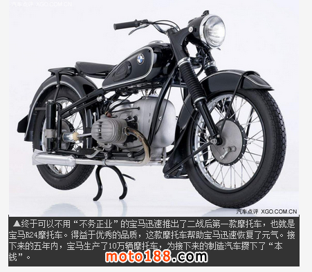 一直到了1948年,得益于銀行家(Hans-Karl Von Mangoldt-Reiboldt)的幫助,寶馬終于免于破產(chǎn)并得到了準(zhǔn)許生產(chǎn)摩托產(chǎn)的許可,結(jié)束了二戰(zhàn)以后多年的破產(chǎn)監(jiān)管狀態(tài)。