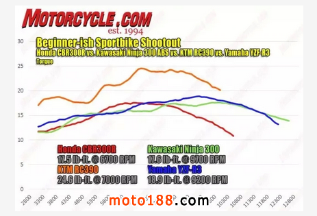 扭力曲線給我們帶來了額外的有趣信息,KTM依舊憑借排量的優勢在這個環節繼續橫掃全場,可是它的出力卻不夠線性,4500rpm左右扭力甚至比之前有所回落。川崎和雅馬哈奇虎相當。本田在這個環節顯然墊底,不但可用轉數最少,發力區間也相對狹窄。