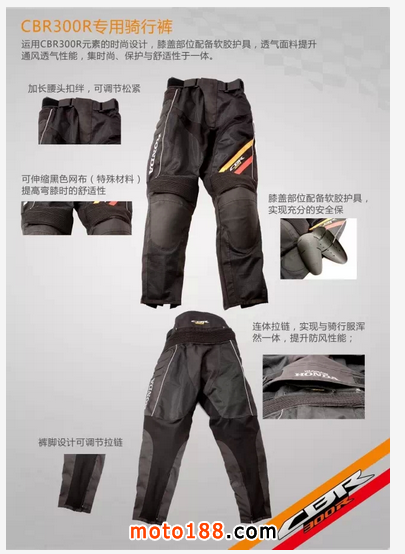 騎行裝備有四寶:頭盔、衣服、褲子和手套,深諳細節出真章的CBR300R大牌們最起碼備上兩者以上才出門,達到瘋狂境界的全副武裝也不過如此。騎行裝備除了表面設計體現出CBR300R的風范外,在功能和細節上做到極致。