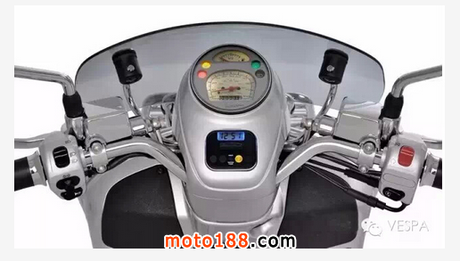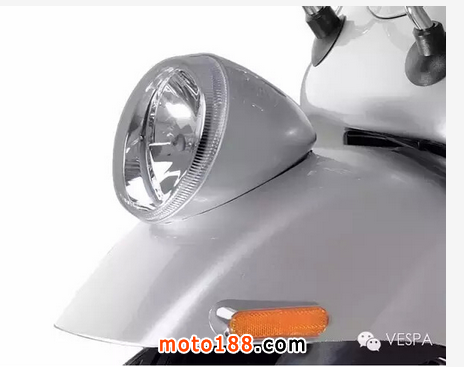 全新金屬銀灰色車身涂裝,讓GTV擁有非凡的優雅質感,視覺效果一目難忘。安裝在前擋泥板上的前大燈,以最早的VESPA設計為藍本,明示著VESPA的起源。大燈下移之后,車頭部分添加了鍍鉻行李架,而VESPA GTV的手把重現了最早期VESPA的金屬管飾面,在當代摩托車中再次喚起流行風潮。傳承經典的方向柱蓋采用機械圓形儀表,油量顯示和時速表完全分開,下方還有單獨時間顯示和功能提示燈,讓人一目了然。