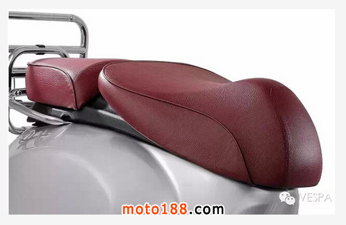 全新縫紉工藝的皮革雙鞍座椅,復古味濃烈。酒紅色皮革包裹,走線嚴絲合縫,寬大尺寸將乘坐的舒適感大大提升!新后尾燈和鍍鉻邊框,以及耀目的前鍍鉻行李架, 配合更易于清理的全新鍍鉻輪轂,與踏板中央印有的VESPA logo遙相呼應,仿佛VESPA最風靡的60年代再現眼前。