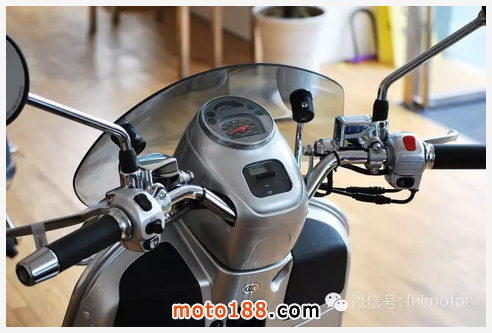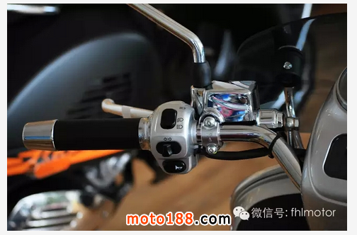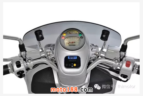 既然大燈下移,車頭部分自然清爽了許多。鍍鉻行李架,無燈設(shè)計車把加上擋風(fēng)板,美觀、實用且對味!而儀表和車把更加有特點,有點類似于LXV車型,方向柱蓋采用機械圓形儀表,油量顯示和時速表完全分開,下方還有單獨時間顯示和功能提示燈,讓人一目了然。車把采用裸露設(shè)計,燈光控制鍵居左,啟動功能鍵居右。