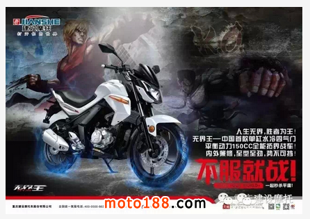 無界王具備多氣門滾流燃燒技術、水冷閉式強制冷卻技術、內置平衡軸技術、共晶硅全鋁氣缸+爆炸噴涂技術、輕量化耐熱耐磨活塞、滾輪搖臂技術、兩級機油精濾技術等先進技術和工藝。無界王由著名意大利機車設計師原創設計,車身線條流暢,動力澎湃,多種關重部件國外進口,強悍的性能指標受到年輕玩車族的青睞。同時,無界王還是中國摩托行業“2014年度最佳車型”榮譽稱號的獲得者,充分展現了建設摩托領先的設計理念和雄厚的制造實力。