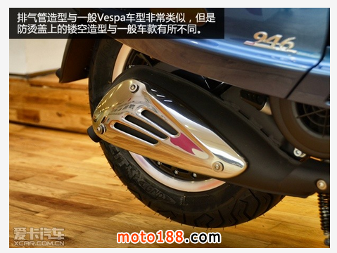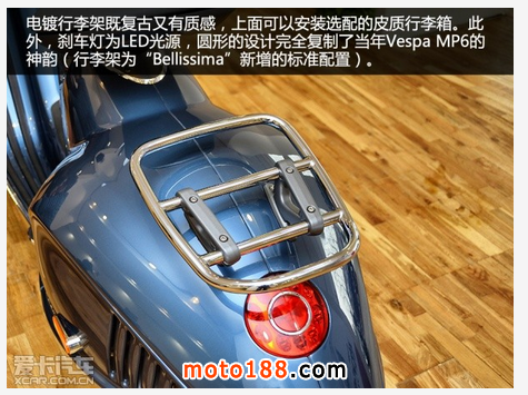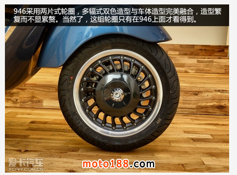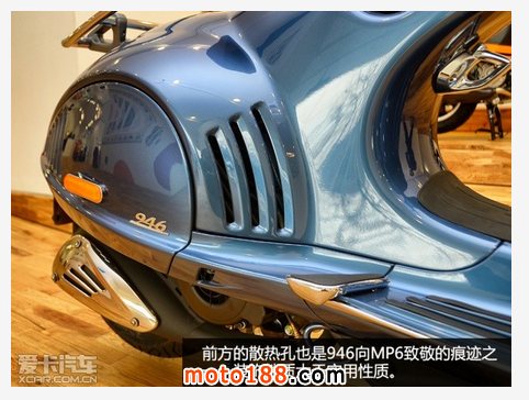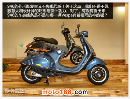 Vespa 946的車體仍然使用鋼制車身,但是前擋泥板與車體后方兩側則使用了鋁合金材質。更令人心醉的是,優美的車身設計在燈光的照射之下所產生的折射,明顯比起其他Vespa更有質感。