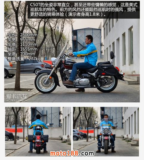 坐高僅有700mm的C50T,帶來了相當(dāng)舒適的乘坐感受。1.8米的騎士可以輕松地將雙腳同時(shí)平貼于地面,也給騎士安穩(wěn)的感覺,畢竟這輛車的重量高達(dá)277kg,若是不能“腳踏實(shí)地”的騎車,對(duì)于騎士的心理壓力可是不小。