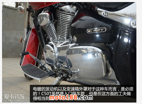 編輯點(diǎn)評(píng):我們所拍攝的C50T為2013年日本進(jìn)口的車型,目前特惠價(jià)12.8萬元。以它的做工用料而言,算得上是物超所值了!整體而言,C50T雖然是一輛充滿男子氣概的美式巡航車,但是鐵漢也有細(xì)膩的一面!此車在細(xì)節(jié)展現(xiàn)出日本車廠慣有的細(xì)膩,造工、模具的細(xì)致度都屬上乘之作。而且,在質(zhì)量的優(yōu)勢(shì)之外,日本的美式巡航車在外形上也越來越有美式風(fēng)范,看起來不再像是四不像的仿制品。或許,C50T是給那些注重質(zhì)量,卻又喜歡美式風(fēng)格摩托車的車主,一個(gè)最佳的選擇!