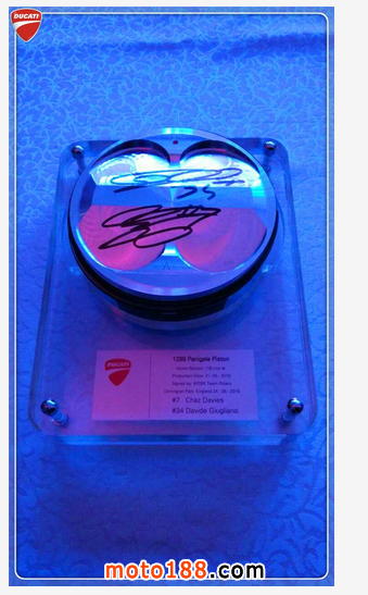 (一枚活塞的神奇之旅:這枚活塞在意大利生產(chǎn)后,隨即空運英國,由WSBK的兩名車友為其簽字,且它還為這兩名車友帶來好運,讓其分別獲得了WSBK亞、季軍獎項。隨后又空運香港,杜卡迪總經(jīng)理麥曉剛先生在下班前5分鐘才收到此枚活塞,立馬又攜帶它乘坐飛機,并把它送到活動現(xiàn)場。因此,我們有理由相信它能帶來好運)