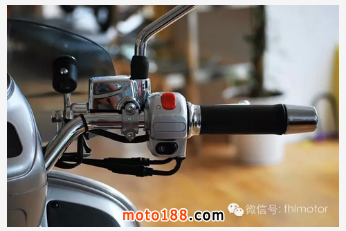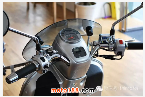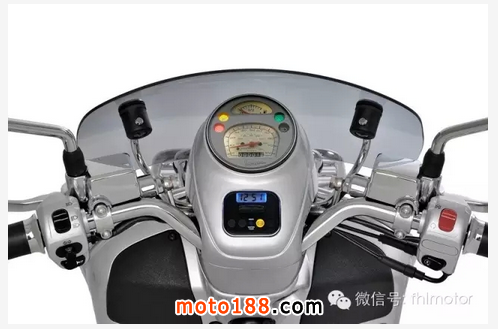 既然大燈下移,車頭部分自然清爽了許多。鍍鉻行李架,無燈設計車把加上擋風板,美觀、實用且對味!而儀表和車把更加有特點,有點類似于LXV車型,方向柱蓋采用機械圓形儀表,油量顯示和時速表完全分開,下方還有單獨時間顯示和功能提示燈,讓人一目了然。車把采用裸露設計,燈光控制鍵居左,啟動功能鍵居右。