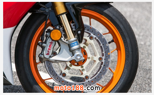 43mm的全段可調Ohlins倒置前叉和TTX系列避震是這款SP最大的看點之一,這套避震可以說真的無可挑剔,尤其是在賽道上的表現更是讓我滿意。從上次試駕CBR1000的時候,本田就對這款車型的坐姿進行了細微的調整,腳踏的位置后移了10mm,這個改變對舒適性并沒有什么提升,而是對車子在彎道中的壓彎有一些幫助。坐墊的感覺還是那么的硬,或許是競爭對手們的坐墊設計的太過柔軟。