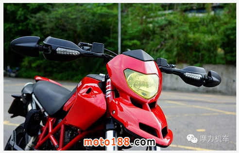 車頭,Hypermotard 796的大土除采用與車身相同顏色烤漆,搭配把手尾端的收折式后照鏡,以及越野車常見的謢弓,并在護工前端安裝方向燈,讓車頭的線條簡單又特殊。