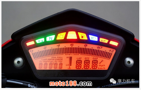 而儀表板的功能,則超乎我所想的多,上方指示燈部分從左到右分別是超轉燈1、方向燈、空轉燈、引擎故障燈、超轉燈2、油量不足警示燈、遠燈指示燈、機油油壓不足警示燈、超轉燈3,左下角則有單趟里程、總里程、油量不足正數里程、時鐘、保養提醒里程、電壓偵測、數字顯示引擎轉速表、計時用顯示區;右下角則除了時速表以外,另可對應左下的模式顯示目前功能,如要顯示電瓶電壓時,左下角的區域會顯示電瓶電壓值,或者顯示LOv/HIv,右下角的區域則顯示"BAT"字樣,代表目前儀表板所顯示的數值為 BATTERY (電瓶),這些功能可在說明書中了解甚多,并且可以注意到左下角的顯示區中,有一個 DDA 的功能,這功能可以獨立出來說明。