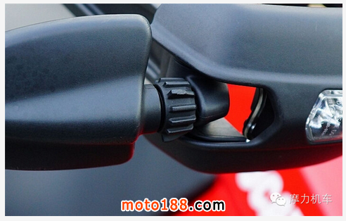 可收折的后照鏡,直接安裝于把手尾端,造型與護弓相呼應,不過在實用性上,這組后照鏡沒有比普通位置的后照鏡來得好用,可視角過廣的情況下,調整需要更費功夫,才能找到適合自己的后照鏡角度。