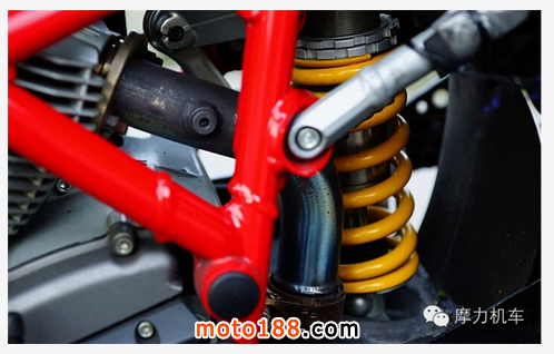 位于后搖臂前上端的 Sachs 預載及阻尼可調避震,行程 135mm,路感輕柔確實,并且也方便調整,以入門的 DUCATI 而言,算是非常有誠意的。