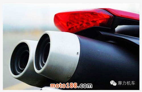 排氣管部分,管體溫度不算太高,但在炎熱的夏季還是需要稍微注意,而雙管的角度可從圖中發現,當氣體離開排氣管后的路線會沖突,有一部分說法是為了減輕后方車輛的不適感,避免未減壓的氣體直接沖擊后方騎士,燃燒過的氣體在離開排氣管后相撞,會互相抵銷氣體的沖擊力,讓廢氣壓力不會這么明顯。