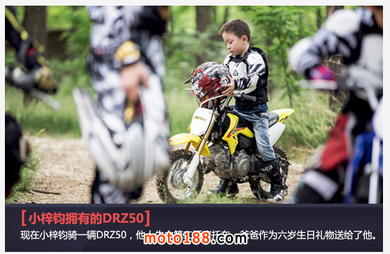 現(xiàn)在小梓鈞騎一輛DRZ50,讓人羨慕甚至嫉妒的是,這已經(jīng)是他人生中的第二輛摩托車,在六歲生日那天爸爸作為生日禮物送給了他。第一輛是在4歲半時(shí)得到的一輛50CC小跑車,因?yàn)椴倏匦阅懿蝗缭揭败嚭茫瑑H有的幾次騎行也是速度非常慢,在爸爸的協(xié)助下完成。