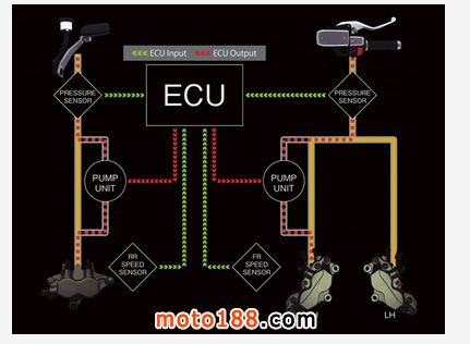 采用了通過電子控制前后連鎖制動的K-ACT(Kawasaki Advanced Coactive-braking Technology) ABS系統。除了普通的ABS,根據行駛狀況合理的分配前后部分的制動力,以達到有效的制動效果的騎手支持功能。