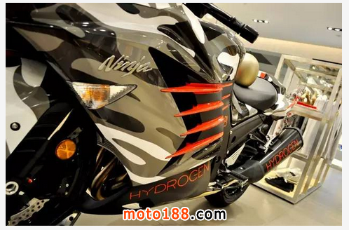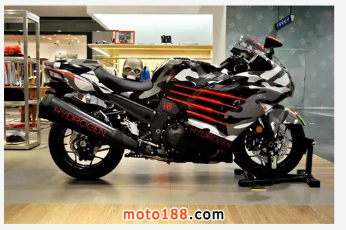 NinjiaZX-14R一改川崎摩托原本的綠色忍著形象,搖身一變,專屬于HYDROGEN的迷彩與骷髏酷炫登場,奪人眼球。