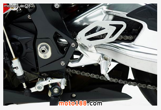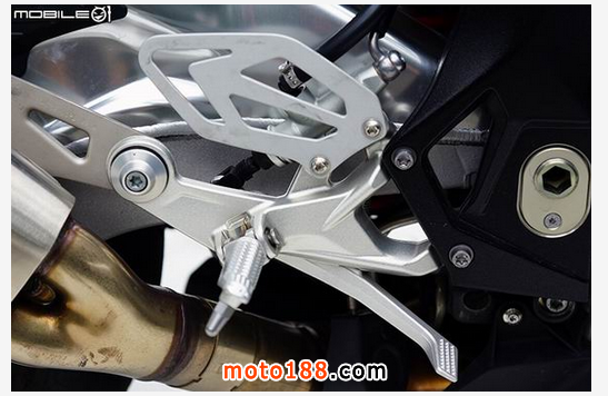 腳踏桿與打檔桿部分,S1000RR 的腳踏桿位置也是不可調整,不過打檔桿就有趣多了,仔細看會發現有兩個鎖點,圖中已經鎖上一組在打檔桿尾端,這樣是屬于正常的國際檔換檔模式,也就是從空檔踩下后進入一檔,往上用力勾進入二檔,再勾就進入三檔并依此類推,但當將球頭改鎖在后方位置,原本的一踩二勾轉變成為一勾二踩,覺得眼熟嗎?這正是比賽車會使用的反打國際檔!從空檔向上勾為進入一檔,一檔往下用力踩會進入二檔,再往下踩進入三檔并依此類推,這種換檔模式僅限賽道使用,最主要是因為在出彎時要升檔加速,用踩的比用勾的快又方便,因此在賽車場上大多數打檔車都是使用這種反打換檔的。