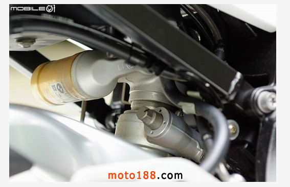 在仿賽車款中必備的前輪防甩頭部分,能避免中高速時因操作錯誤所產生的龍頭甩動失控情況,不過這組防甩頭為手動調整松緊度,并不是由電腦控制的電子式防甩頭,在電子配備滿載的 2015 S1000RR 上獨漏這部分,稍微有些可惜。