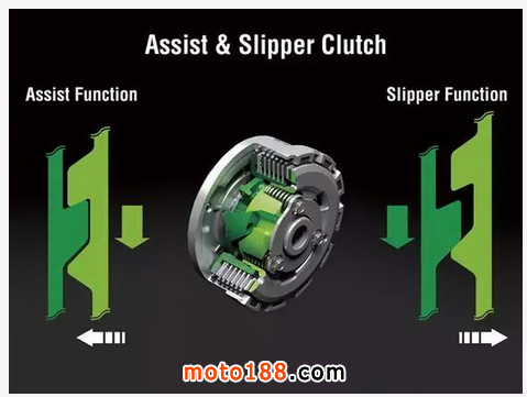 標準化裝配有從賽車界誕生的輔助功能和滑動式離合器。在離合器中央和壓力板的嵌合部分提供了輔助凸輪和滑動凸輪這兩種凸輪,是一種過去沒有的具有兩種新功能的新的離合器。 通常在引擎轉動時,輔助凸輪帶來的自我支持效果可以調節離合板的接合。由此可以減輕對離合器桿的操作力。此外急減速或者過度引擎制動時,滑動技能開始生效。滑動式凸輪減弱離合板的接合,避免反向轉矩,減低了后輪的調頻及打滑概率。