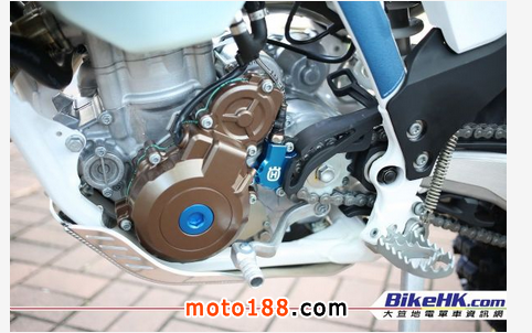 眼前的FE250有不少都是后加的配件,基本上車身的藍色金屬配件都屬額外補品。車架兩邊的藍色防滑貼也是后加補品,而最漂亮的莫過于兩邊水箱的Husqvarna標志貼。前制動加上了保護蓋,圓片剛好保護了菊花碟,但又不會防礙散熱。車底的保護片是必備的選擇,而這一保護片更提供了大范圍的保護。