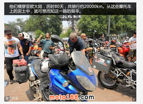 前不久,在北京798藝術區舉辦的一次活動中,我有幸見證了一個比“環島”更具挑戰的壯舉。13名英國騎士從倫敦出發,橫穿亞歐大陸,最終抵達北京。這段夢幻般的旅程歷時80天,共計行駛約20000km。在他們之中,也不乏年過古稀的騎士。從那13部飽經風雨的摩托車上,我們也能大致了解這一路的曲折。