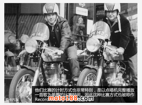 Café Racer起初是嘲諷那些在Ace Cafe門口競速的年輕人,反叛且激進的他們對速度有著近乎瘋狂的渴望,加之對于搖滾樂的熱愛,讓競速比賽與點唱機巧妙結合。他們從餐吧的門口出發,以點唱機完整播放一首歌曲的時間為準,最先回到起點的車手獲得勝利。這種方式也被稱作為Record-Racing(唱片競速)。
