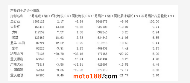據(jù)中國汽車工業(yè)協(xié)會(huì)的統(tǒng)計(jì)數(shù)據(jù)顯示:6月,全行業(yè)完成摩托車產(chǎn)銷166.21萬輛和168.45萬輛,環(huán)比增長2.17%和2.43%,同比下降8.84%和8.72%。其中,二輪摩托車產(chǎn)銷147.58萬輛和149.44萬輛,環(huán)比增長4.08%和3.96%,同比下降9.47%和9.54%;三輪摩托車產(chǎn)銷18.63萬輛和19.01萬輛,環(huán)比下降10.08%和7.97%,同比下降3.49%和1.68%。
